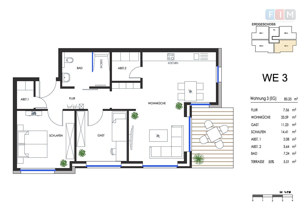 Diese Wohneinheit im Erdgeschoss umfasst 85,25 m² Wohnfläche. Sie bietet eine offene Wohnküche, zwei Schlafzimmer und zwei praktischen Abstellräume. Zu dieser Wohnung gehört eine Terrasse und eine Freifläche in Form eines Privatgartens!